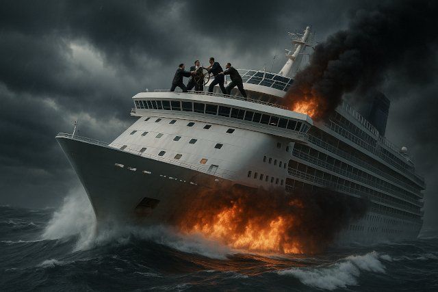 Ein riesiges Kreuzfahrtschiff kämpft im Sturm, eine Seite brennt lichterloh. Schwarzer Rauch steigt auf, Wellen peitschen gegen den Rumpf. Auf der Brücke ringen Männer um das Steuer – Symbol für den Kampf um Kontrolle.