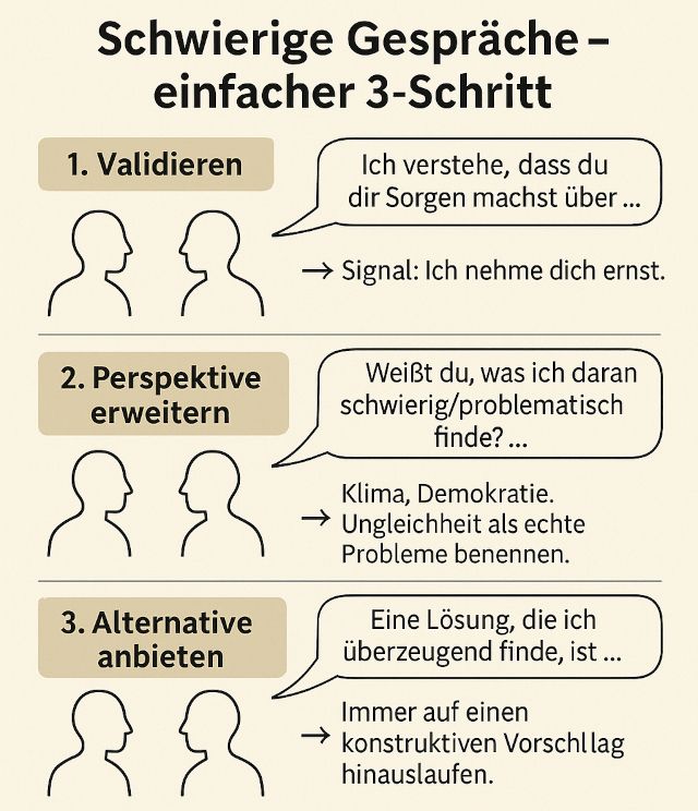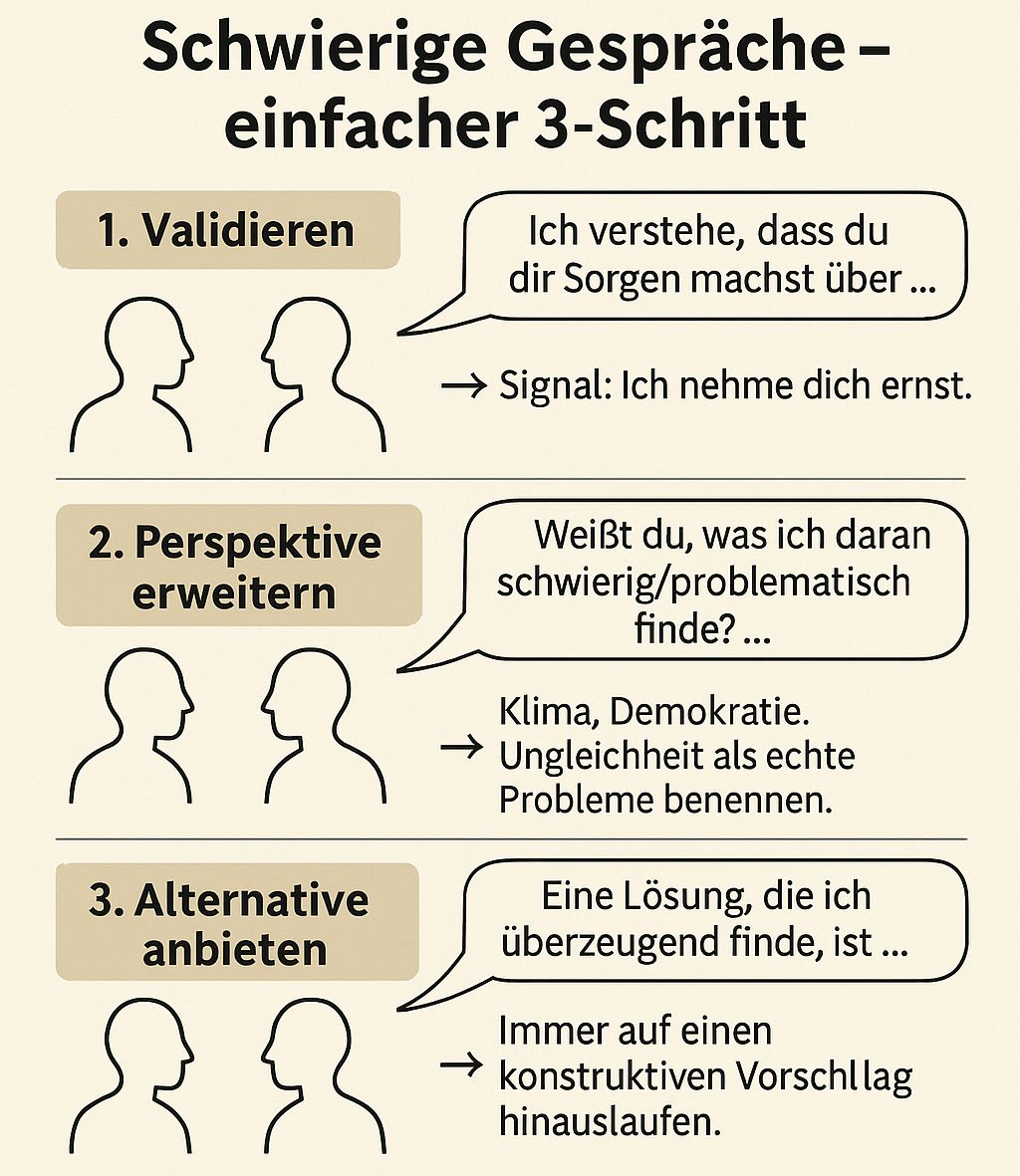 - Strategien und Werkzeuge liefern: Wir skizzieren politische Hebel (zum Beispiel faire Klima- und Steuerpolitik), kommunikative Strategien gegen rechte Narrative und konkrete Praxisformen: von Energiegenossenschaften ĂŒber BĂŒrgerrĂ€te bis hin zu GesprĂ€chsleitfĂ€den fĂŒr den Familienchat.